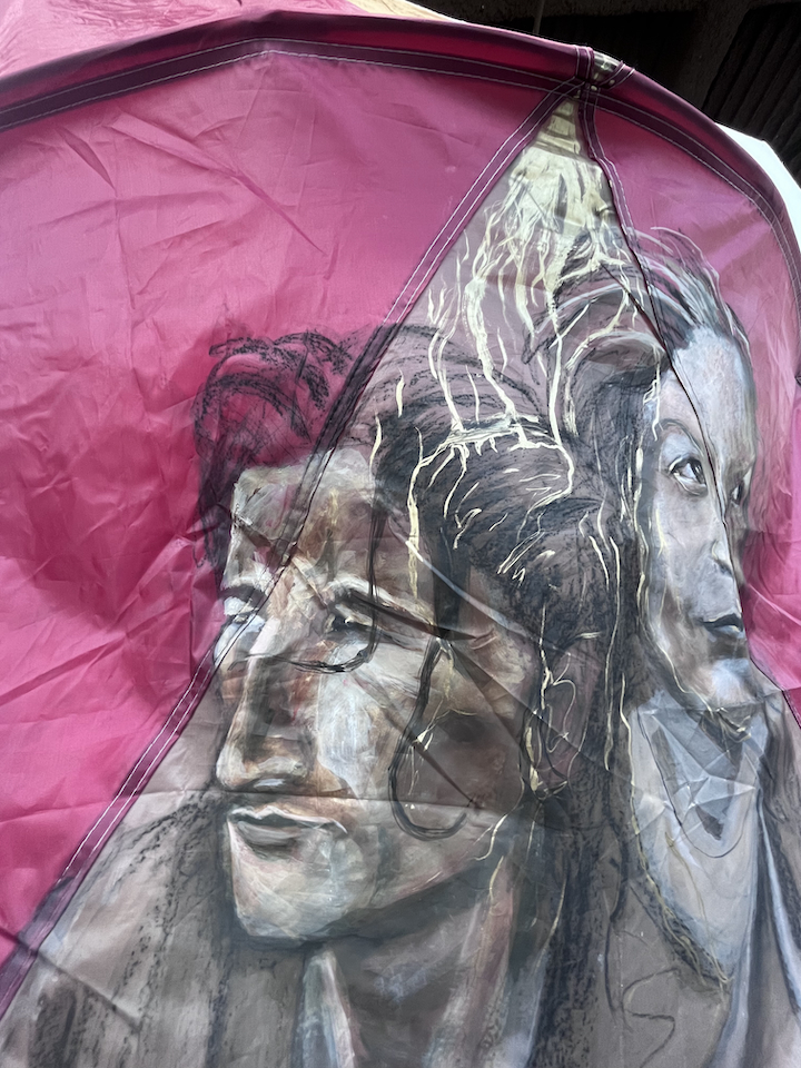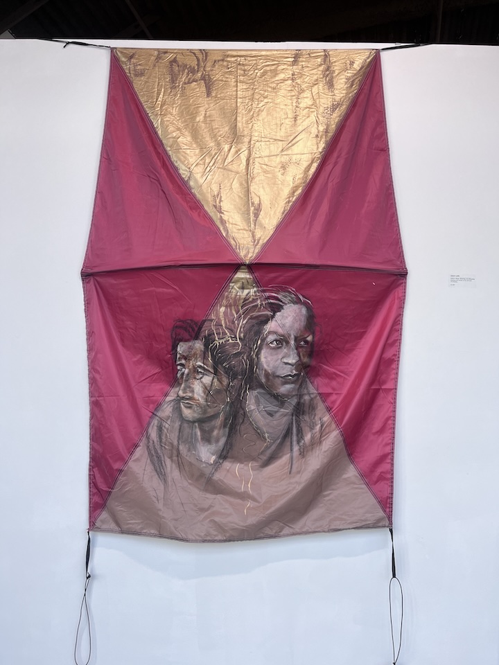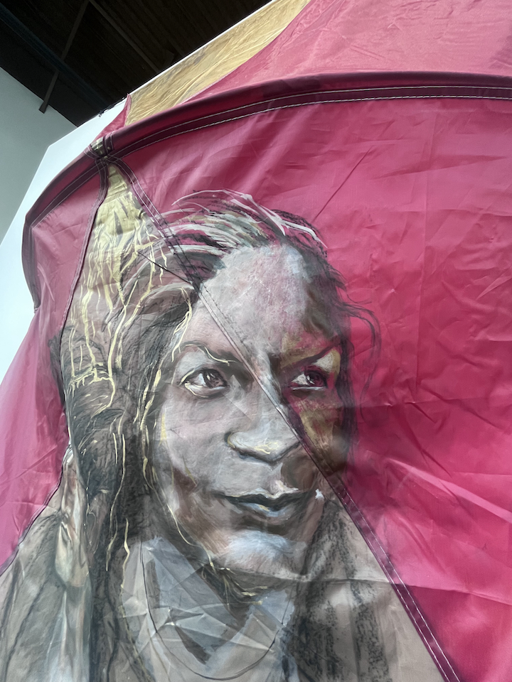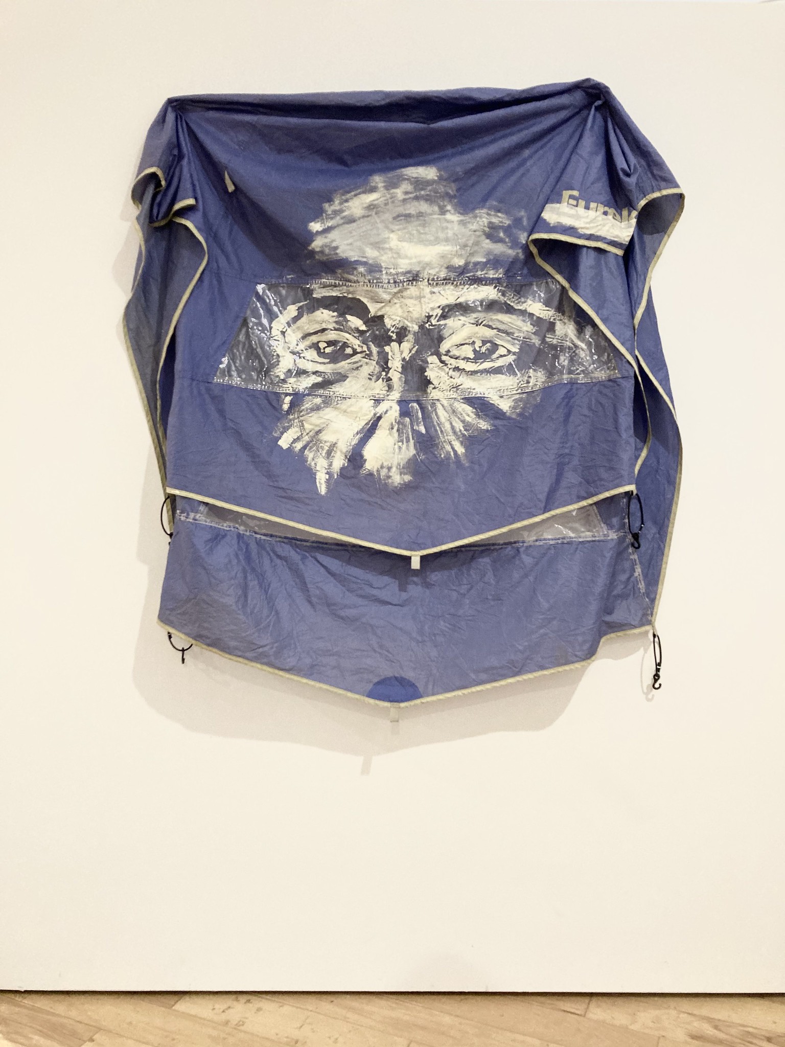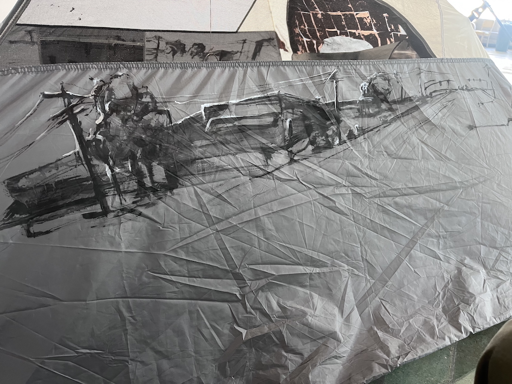 charcoal and acrylic paint on tent fly