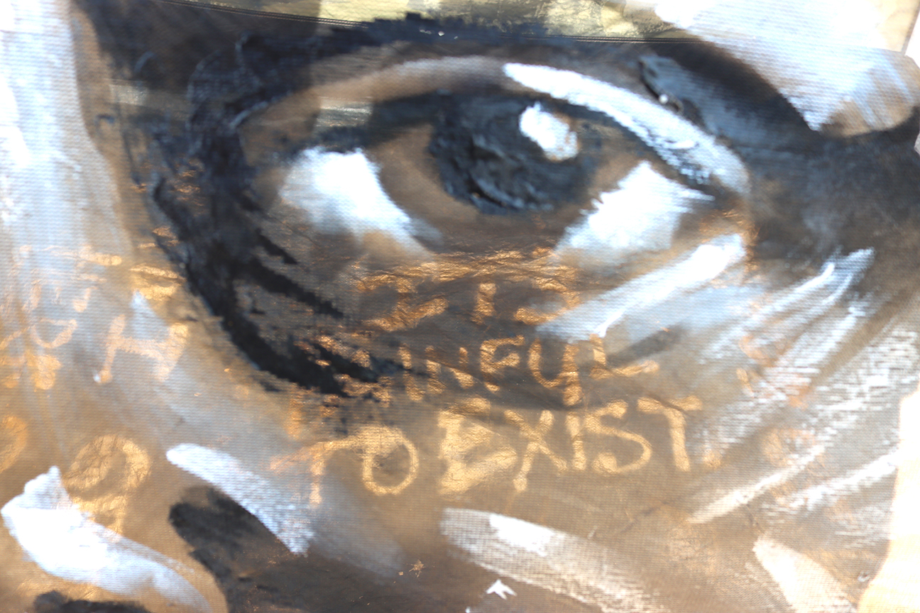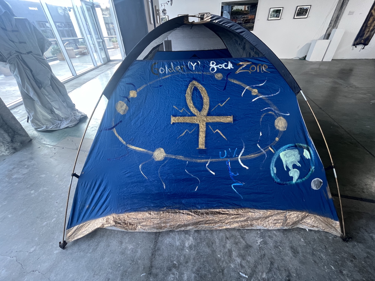 Spraypaint, silver leaf, acrylic on tent