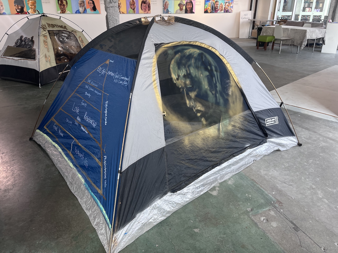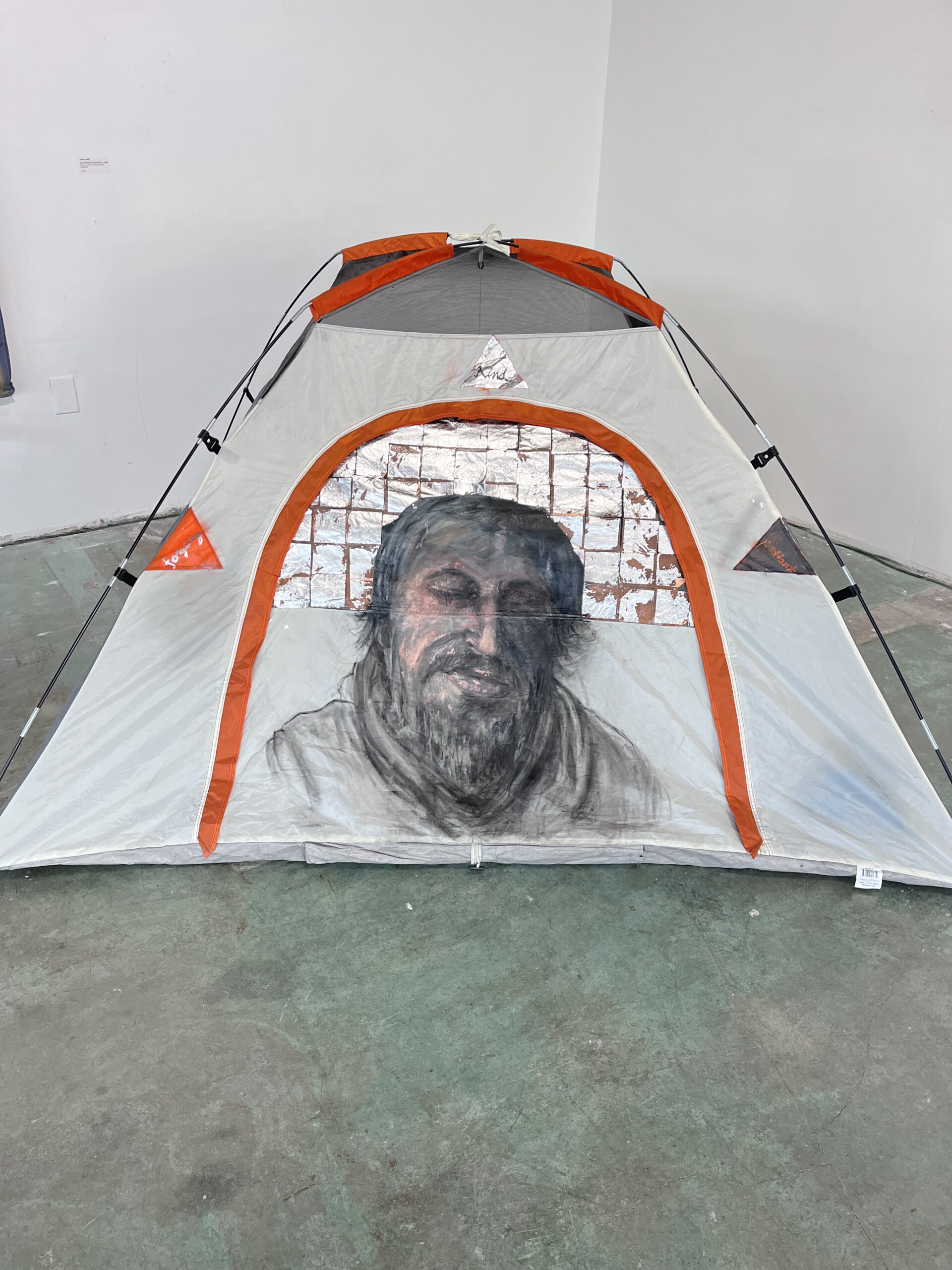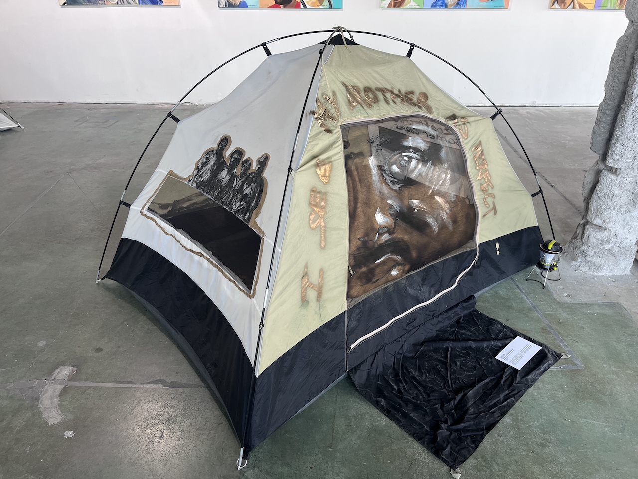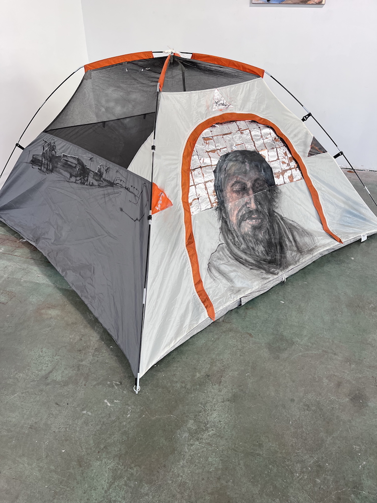 acrylic and spray paint on pitched tent