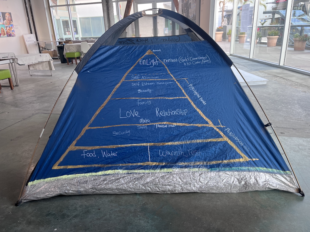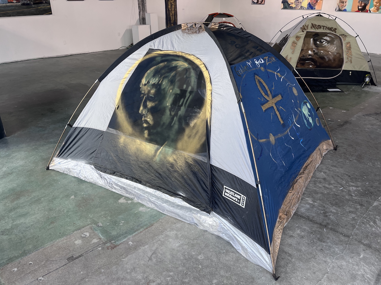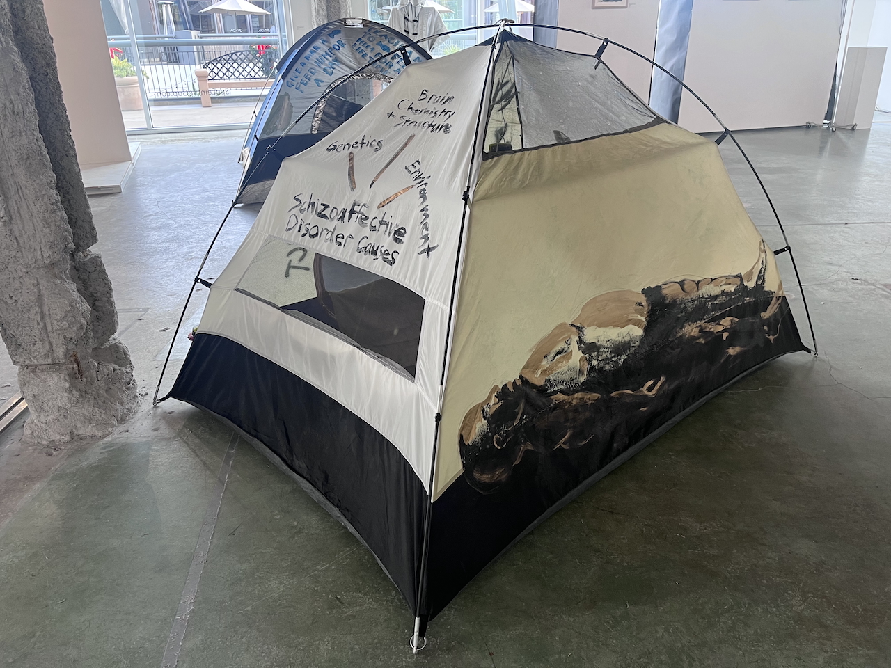 acrylic and spray paint on pitched tent