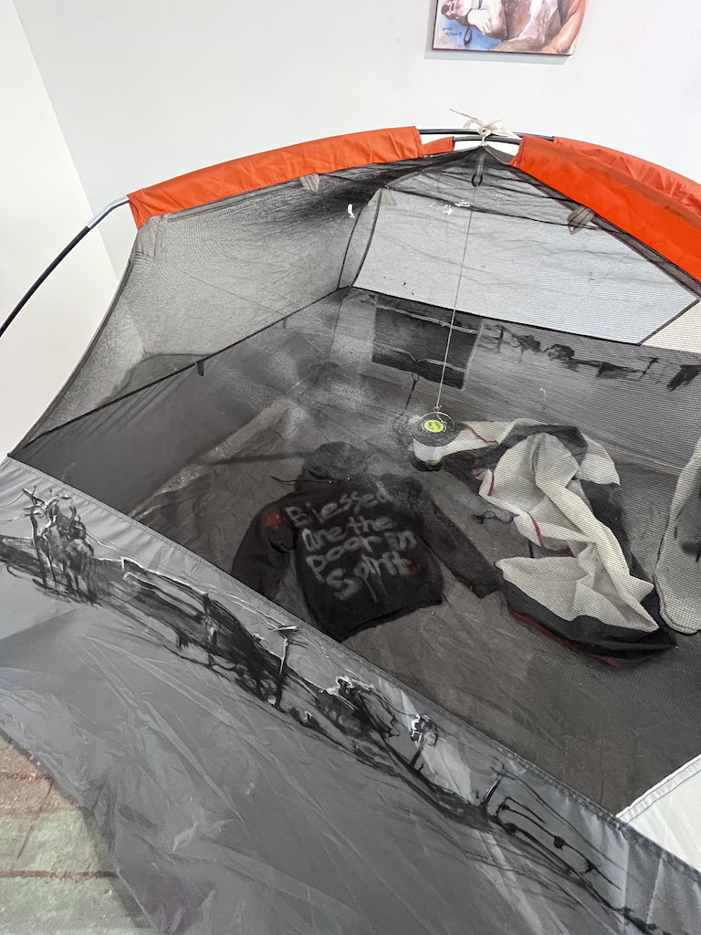 charcoal, acrylic, silver leaf on pitched tent, lantern, rain fly, sweatshirt 80x80x55"