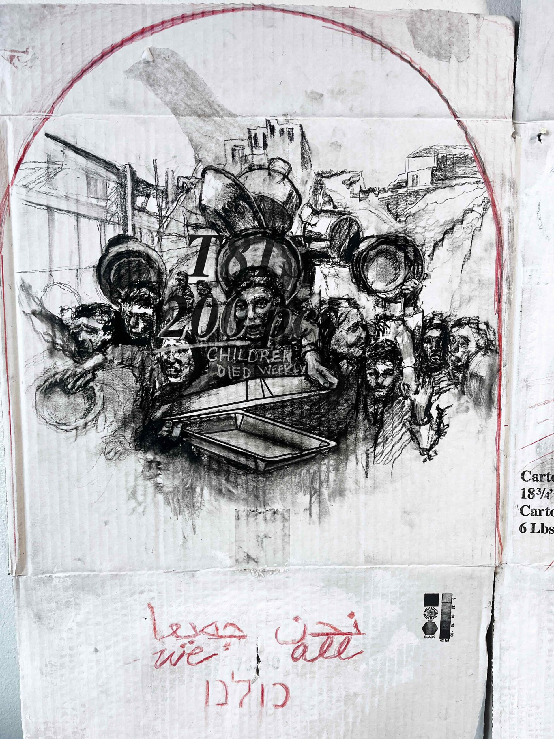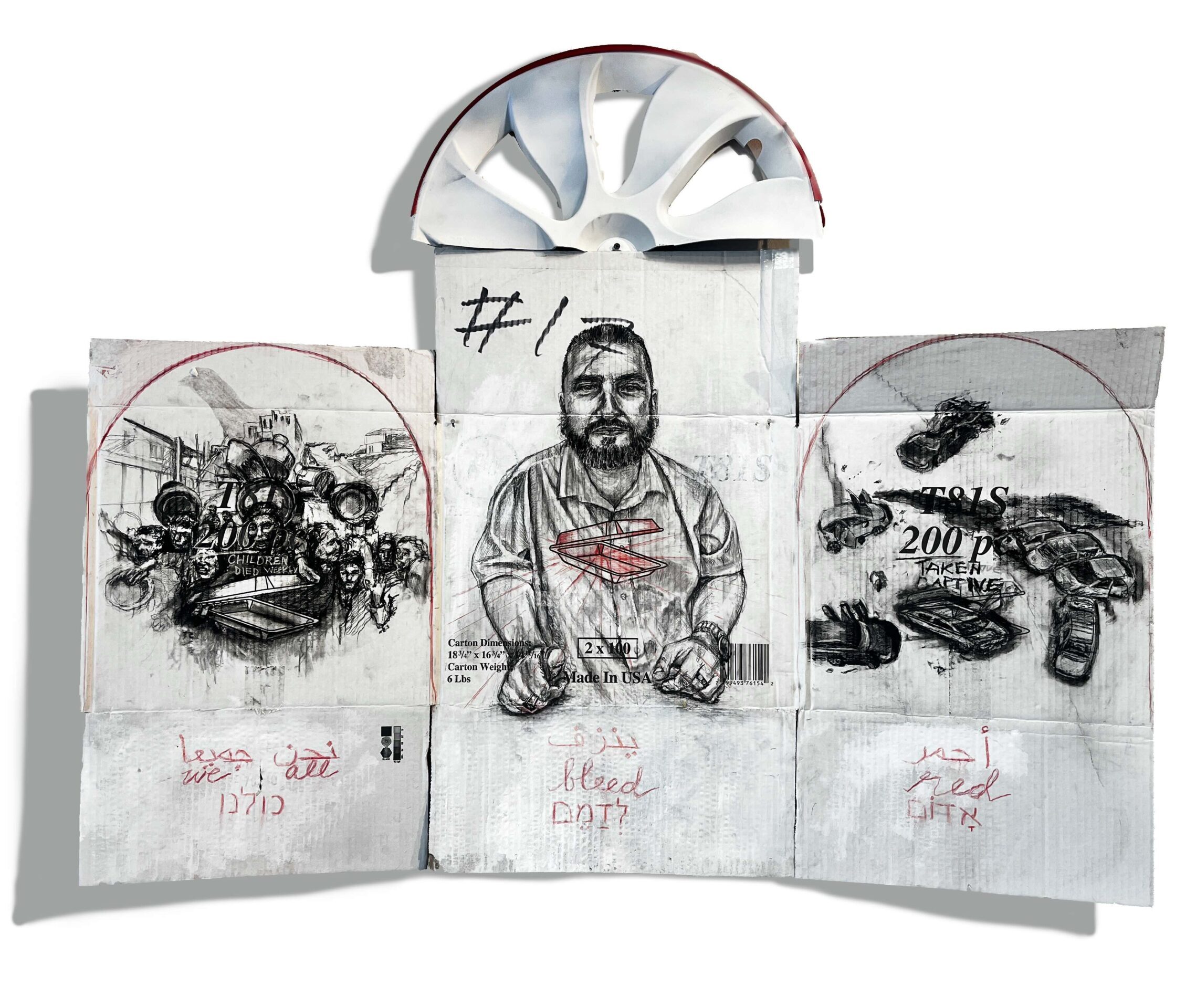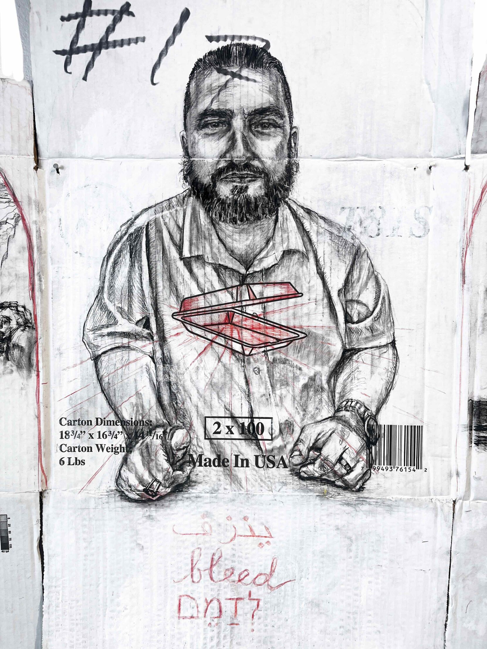 The composition reflects this tension: one panel shows the aftermath of Hamas’ October 7 attacks, the other children in Gaza grasping for a ration of food. The portrait is created on a cardboard box that once held 200 styrofoam food containers—the very same ones I would see Sid holding and giving away at the HUB. The portrait attempts to depict Sid’s generous heart, bleeding for others as he shares the little he has.