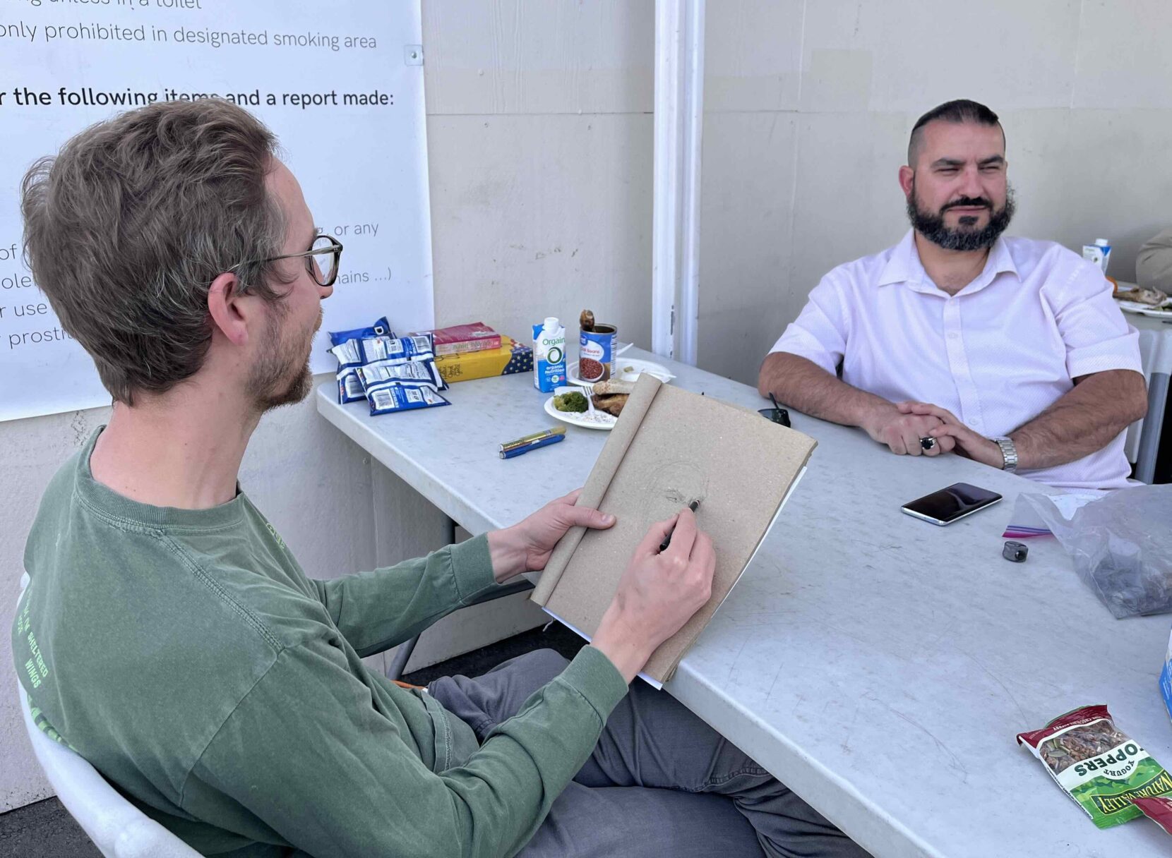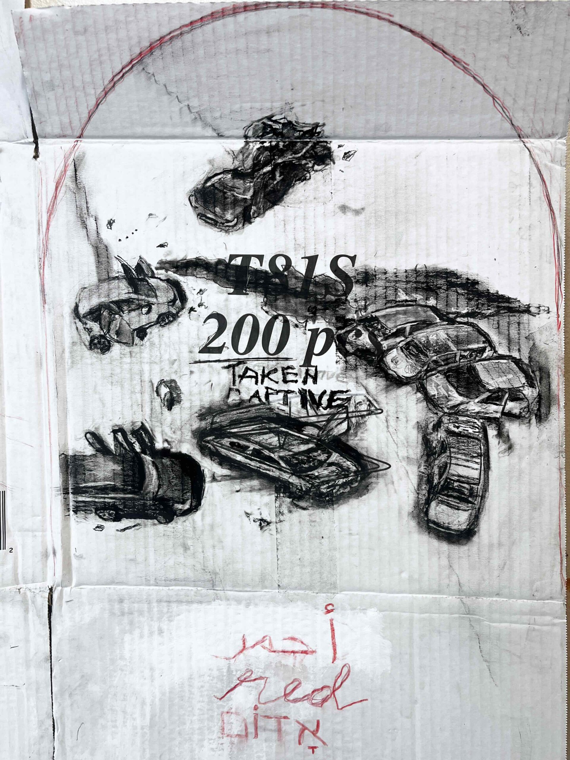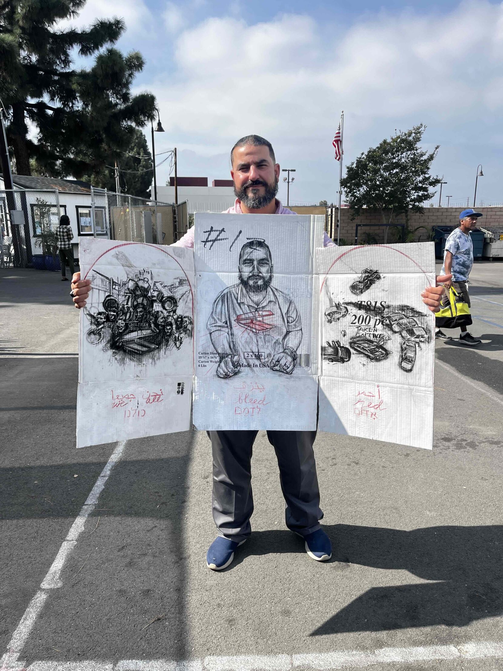 The composition reflects this tension: one panel shows the aftermath of Hamas’ October 7 attacks, the other children in Gaza grasping for a ration of food. The portrait is created on a cardboard box that once held 200 styrofoam food containers—the very same ones I would see Sid holding and giving away at the HUB. The portrait attempts to depict Sid’s generous heart, bleeding for others as he shares the little he has.